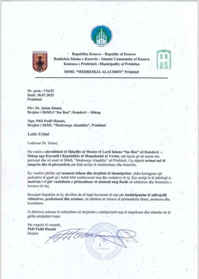 Në emrin tim personal dhe të stafit të Medresesë “Isa Beu” në Shkup, ju shpreh mirënjohjen e thellë për urimet tuaja të sinqerta me rastin e akreditimit të institucionit tonë.